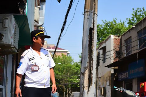 這根電線(xiàn)桿因何而開(kāi)裂呢?巡查到此的未來(lái)路大街巡防隊(duì)員張根生說(shuō)出了原委。